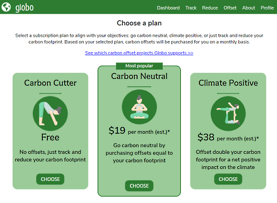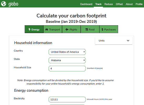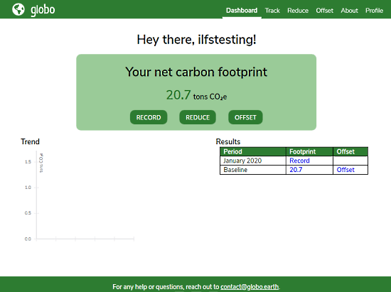 Globo is a free online carbon footprint calculator that helps you track, reduce, and offset your carbon footprint. On this website, you can keep track of your annual carbon footprint based on energy consumption, transport, flights, food, and purchases. Then, you can set a target to reduce your carbon footprint and take day-to-day actions to meet your goal. Apart from that, you can also purchase offsets to go carbon neutral. This way, you can keep an annual record of your carbon footprint and try to be carbon neutral.