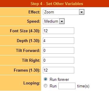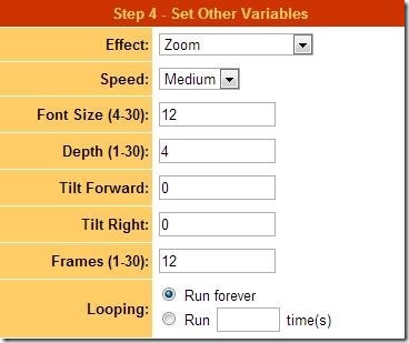 Step 4: It provides you variety of variables, like: effect, speed, font size, depth, frames, looping, etc. These variables can be adjusted as per your choice to create stunning 3D banners.