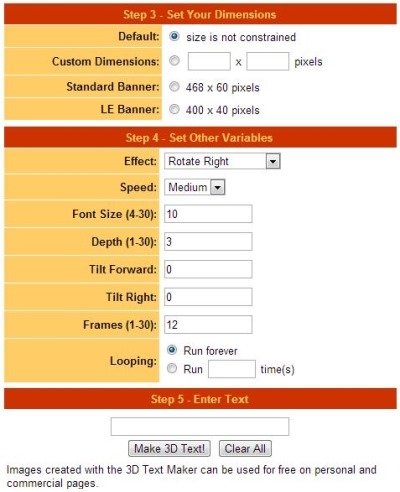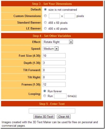 Step 5: This is the most important step as it lets you enter the desired text, of which you wish to create 3D banner. Soon after finalizing all the elements, you can hit ” Make 3D Text” button to create custom banner. In case you are not satisfied by the entries in all the steps you can opt to click on “Clear All” button to recreate another banner.