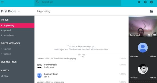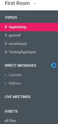 The column on the left side of the screen will show a list of all the topics, direct messages, live meetings and files. A screenshot of this sidebar can be seen below. Clicking on any of these tabs will open up that particular topic, file or direct message. Under topics you will see a topic name scratchpad, in this whiteboard any information you type will be lost as soon as you log out and end the session. So any sensitive data like passwords can be shared here, which will not be saved.