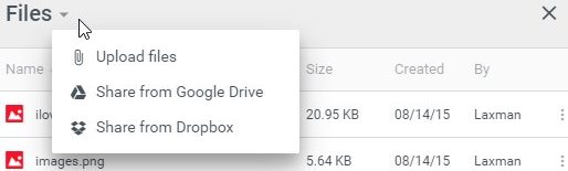 Go to the files tab next to the whiteboard. Click on the small drop down arrow in front of files. This will give you three options upload a file, share file from Dropbox and share file from Google Drive. Select the medium and the file will be uploaded to be shared with your team members.