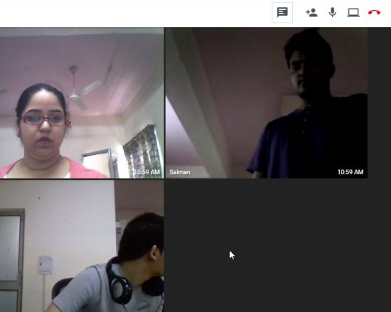 Hover your mouse over the name of your team member and select video call from there. This will connect you with your team member immediately. Now at the top right hand side of the video call window you will see a few icons. There is a red phone icon which can be used to end the video call, there is mute icon to mute the microphone, there is a contact icon with a plus sign this can be used to add more people to the video call. Click on this icon and select the member you want to include in your video call. This will connect the third member in your video call as well. You can also see a screen icon for sharing screen.