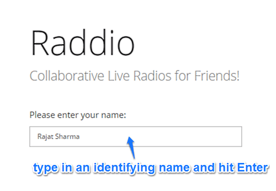 Step 1: Raddio’s is up and ready for action the moment you land on its homepage. Now, before you and your pals can enjoy a radio (channel) and collaborate on it, you need to create the said radio channel. To do so, hit the Green hued Start a Radio button on the left. Once you do that, you’re asked to enter your name (required to identify you in the chat). Key in the name, and hit Enter (because there are no buttons to click). Here’s a snapshot: