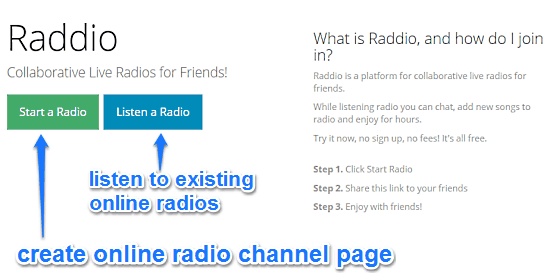 Raddio is an amazing free website that lets you listen to live online radios with friends and chat with them. Exceedingly simple to use, Raddio mashes up collaboration, live streaming, and group chat all together to help you create a personalized streaming radio station that you and your friends can enjoy and contribute to, all while chatting with each other in real time. All you have to do is create a collaborative live streaming radio station (or page, channel, or whatever you’d like to call it), invite your buddies to join in, and have fun together. Apart from creating your own radio channel, you can also listen to already active online radios by searching them via their unique radio IDs. And all it takes is a few clicks. Stoked? Then let’s cut to the chase and find out more, past the break.