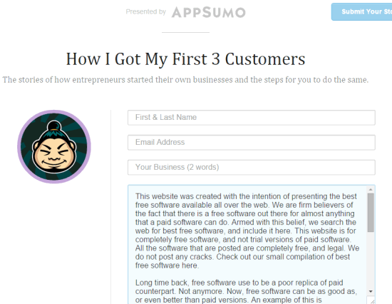 To submit your story, you need to enter your name, business name, email address, and few paragraphs that will describe how you started your business and how you were able to got your first 3 customers.