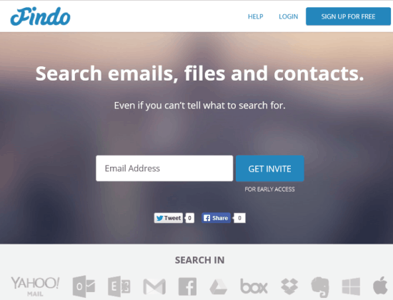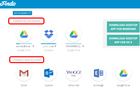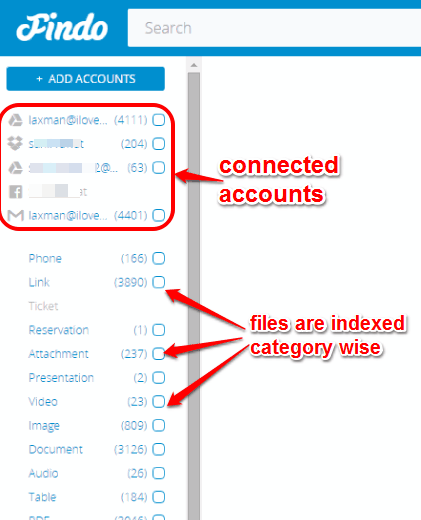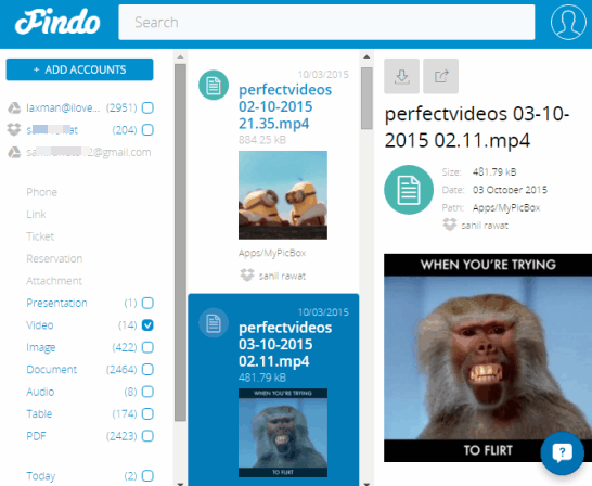 Findo is a free website to search in Google Drive, Dropbox, Gmail, Outlook, Yahoo! Mail, Facebook, and other services simultaneously. So it aggregates all the cloud storage services it supports and makes it very easy to find a particular file. Whether you have to find a presentation, email, video, image, document, PDF, attachment, link, etc., stored in a particular service, you can search for it using the keywords.