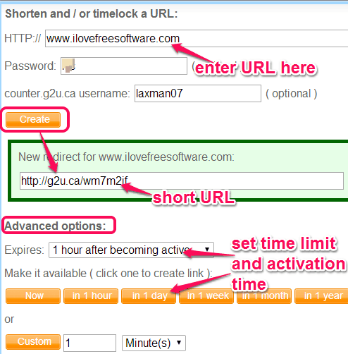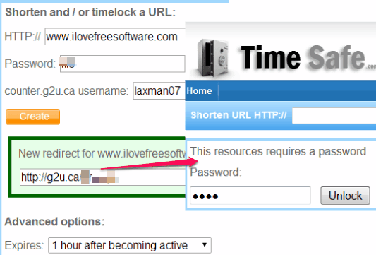 When you go to the website, you will see an option “Shorten and / or timelock a URL”. Using this option, you can shorten URL as as well as add start and end time to URLs. You should be careful while entering the password as it doesn’t cover password behind asterisks or bullets. Provide the original URL and password to secure it and click on “Create”. This will generate the shortened and password protected URL.
