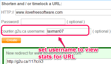 This is an interesting feature (optional) of this service using which you can check number of times your URL is visited by people. While generating your short URL, you will find a ‘counter username box‘, just below to Password box. Using this box, you can add any username of your choice. This username is used to view stats for a particular URL.
