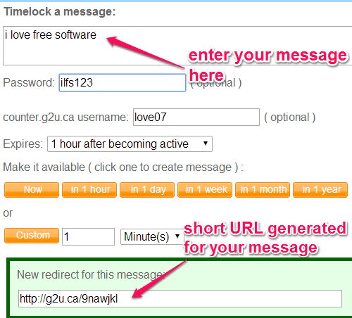 This option is available below the URL shortening option. It is used to create a custom message and password protect its URL, and set start end time. You can write any message or paste any document’s text content at required box. After this, you can set password for your URL. Once done, click on Create button, and your URL for that message will be generated. Time limit and activation limit for message URL can also be set by you. Thus, all details that you need to fill while generating a short URL are available in this option too.