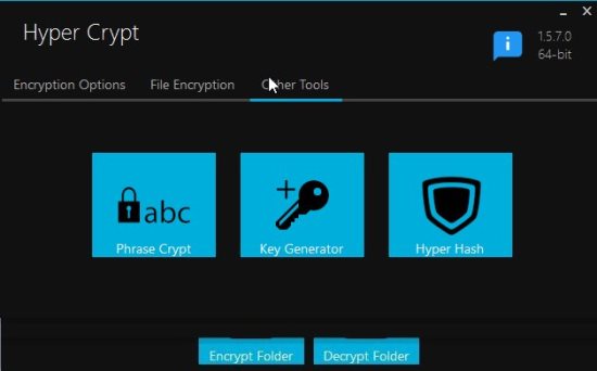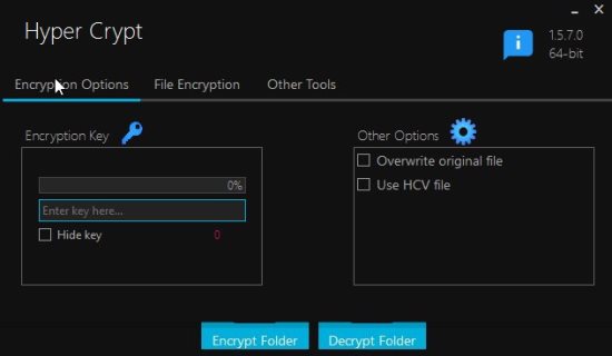 Hyper Crypt is a fast and easy to use app. You don’t need to install anything and it has lots of tools included with the app. You can easily protect your files or folders using this app and you can be sure that it gives a safe encryption as it uses the AES-256 algorithm. Additional to encryption and decryption you can also generate strong passwords and hash data using the available tools. The text encryption tool can be used to encrypt small text phrases.