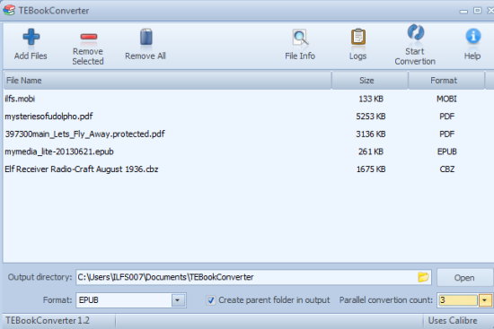 TEBookConverter is a free software that can batch convert ePub files and other eBook format files. It supports parallel processing and upto 16 processors can be used to convert input files which increases conversion speed.