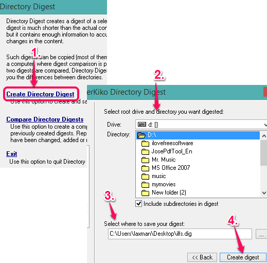 Step 2: Open the interface of this software and click on Create Directory Digest option. After this, you need to select the folder or hard drive of your PC for which you want to create the digest file. See the screenshot below: