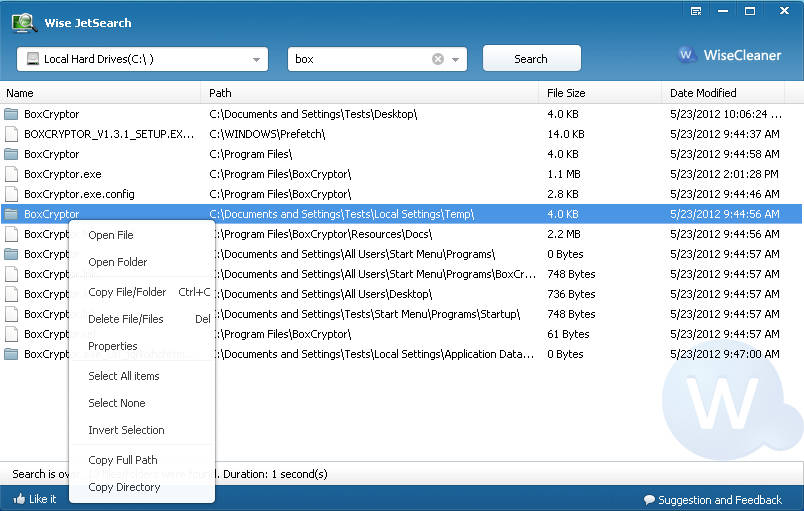 The results for the work box returned a lot more results, which were mainly created by BoxCryptor app. For easier file access Wise JetSearch is offering you to simply right click on the results list and you have several different options to manipulate the found files directly from the program, without having the files opened in the file browser. All in all Wise JetSearch is a decent file search application, definitely give it a try if you need a simple and fast file search.