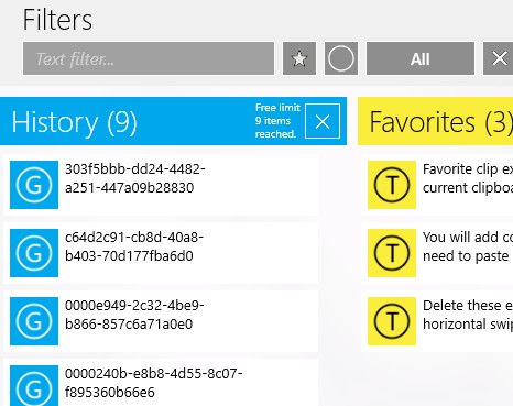 Here we see the Favorites and Timestamps columns. Favorites is of course for saving clipboard items that you use frequently. Timestamps makes it easy to quickly add current time and date to the clipboard, when you need to paste them quickly somewhere. Another, fifth column is available all the way on the right, very similar to Timestamps, only it’s for generating GUIDs. Key features of Clipa.VU are:
