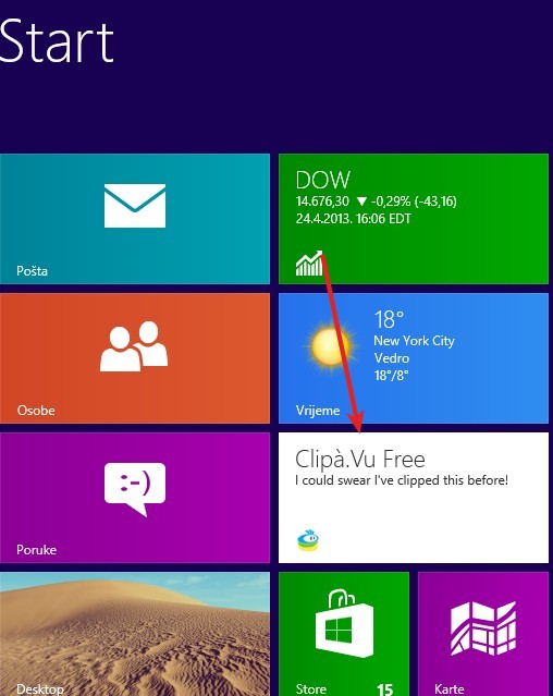 Clipa.VU has to be installed from the Windows Store, if you plan on using the Windows 8 version of course. Once that the installation completes, new tile should appear on the Start screen.