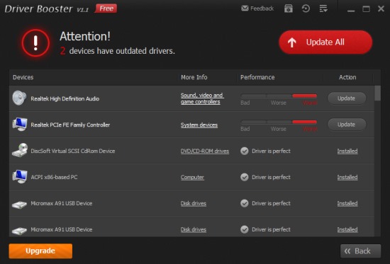 After the scanning is finished, list of all drivers, updated as well as outdated drivers will be in front of you. Now, its your wish whether you want to update all drivers in one go or one by one. Hit Update All button to download all outdated drivers.