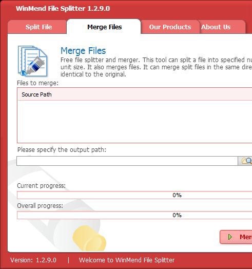 - For merging split files: Browse and add all the split files. If all the split files are in the same directory then its enough if you add the first split file. Else you have to make sure that you have add all the split files from corresponding directories. Then choose the output folder. Once done WinMend File Splitter quickly merges the split files to produce a new file identical to the original file.