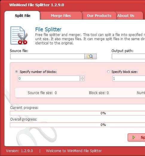 WinMend File Splitter is a free file splitting and merging application. You can download and use WinMend File Splitter absolutely free. This program can split large files into small files of the size you specify, and later merge those files to create the original file again.