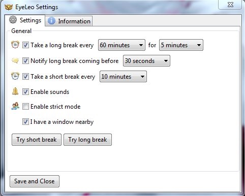 Long breaks could range from 2 to 7 minutes and could be reminded every 30 to 90 minutes. While short breaks last for just a few seconds and could be reminded every 3 to 15 minutes. Each of these reminders can be set through the Settings window accessible from the context menu of EyeLeo’s tray icon.