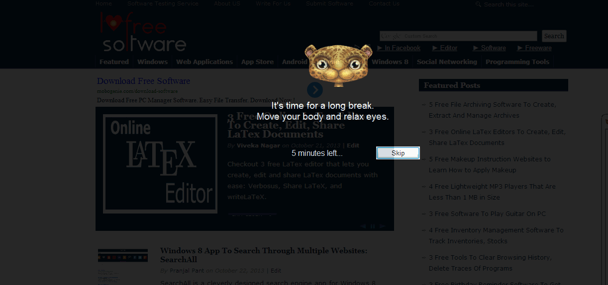 EyeLeo is a great break reminder to get reminders for taking breaks at regular intervals while working on computer. The two reminder modes and the exercise tips not only helps in keeping the eyes strain-free, but also helps in preventing us from sitting all day long on computer, thereby reducing the chances of neck pain, backache, etc. If your work requires using computer for long hours, you must install this small piece of software and remind yourself of timely break needs.