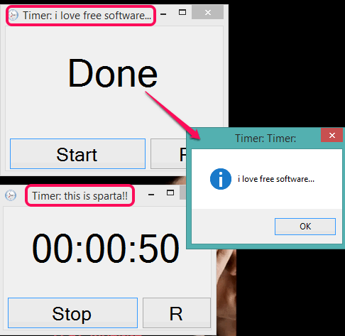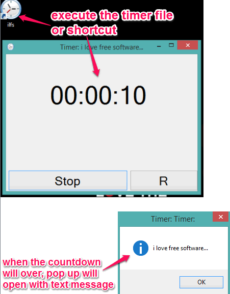 Whenever you want to launch a timer, just double-click its shortcut or file. It will start the timer and countdown will begin. When the timer will stop, it will speak out the text message. After a few seconds, text message will also appear on a pop up.