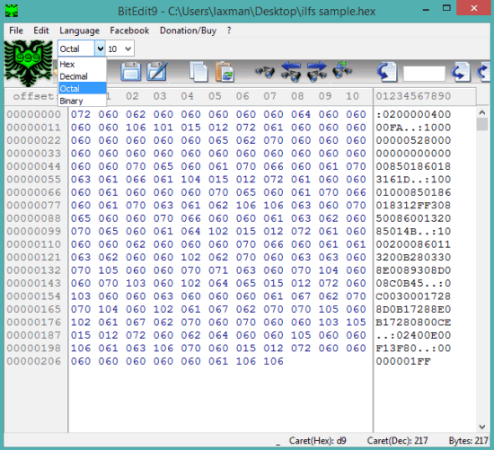 Another useful hex editor software in this list is ‘BitEdit9‘. Apart from viewing and editing the hexadecimal file, you can also see Octal, Binary, and decimal representation of a particular file. Left section of its interface shows the offset and right section lets you view the original file values. Option to find a particular value is also available in this software. You can either download its portable version or installer version.