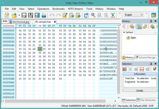 Free Hex Editor Neo is one of the best hexadecimal and binary code data editor software in this list. It lets you manipulate JPG file, EXE, DLL, and other files. So you can check hex values of a file and can also perform changes, wherever needed. You can open multiple tabs on its interface to open different files and edit those files. Option to insert new horizontal or vertical frame is also available. This could help you to manually compare two files.