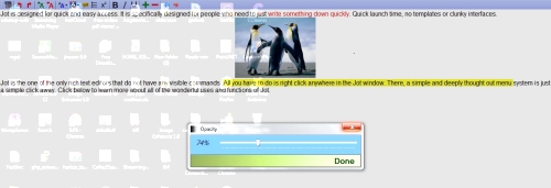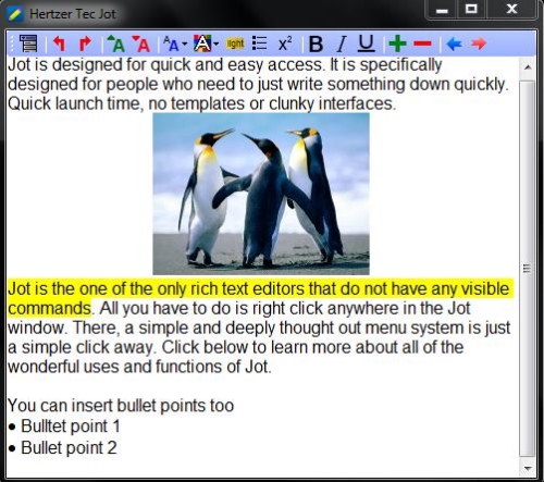 Hertzer Tec Jot is a free note taking software with Advanced Features of a Word Processing software. It supports .rtf and .jot (native format). This software does not require installation and can operate in Sticky Note mode, Overlay Mode and can stay on top of all windows. You can adjust the Opacity to make it appear on top of a document while the document beneath it is still visible. It lets you changes the font, size and color, zoom in or out, highlight the text, insert images and bullet points, lets you align text and indent a piece of text.