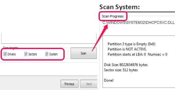 After updating the database, you can move to next step, and can select options for scanning. If you need a deep scanning, enable all options: system, sectors, and drivers. Doing so will let you scan hard drive, all PC drivers, System32 files (including dll files), program data, users data, program files, desktop settings file (desktop.ini), and more.