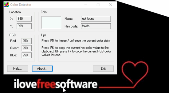 Color Detector is a freeware to detect color names of pixels on screen. From this free color picker software, you can get to know the exact color name of a pixel on monitor, along with its RGB value and Hex code. It also gives you the option to copy the RGB color value and Hex code to the clipboard. It has a minimal interface and is pretty easy to use and fast as well. You just have to hover your mouse over your monitor screen and this free color identifier software will display its color name on its interface, as shown in the GIF below. It continuously changes the color values as per the position of your mouse cursor but it also gives you the option to freeze the current color values. Another good feature of this free color picker is that it always stays on top of a window. So, it doesn’t matter on which part of Windows your are working i.e. web browsers, image editors, etc you can use it to identify the color name of a specific pixel on your screen.