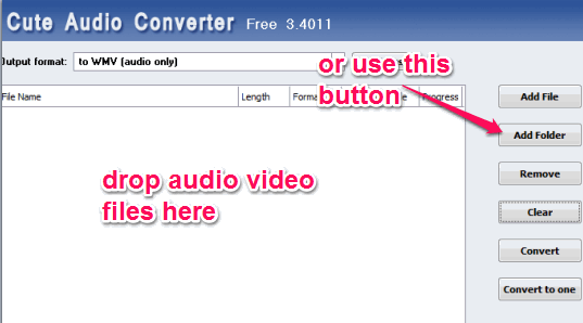 Its interface supports drag n drop feature to quickly add audio video files. You can also choose Add Folder button to add media files in bulk. It supports mp3, wma, ogg, mpa, mka, m4v, mp4, wv, rmvb, tta, ac3, dts, cda, mid, wav, wma, 3gp, mpg, rm, vob, flac, ape, avs, and many more audio video formats.
