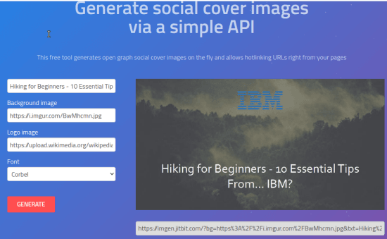 JitBit is a free social media cover generator API to generate social media thumbnails with text and logo. You just make a simple API call and it will take care of all the other things. It instantly generates the social media cover and you can use that on other places as well. It generates a very simple embed code and you can use that in <img> tag on your website.