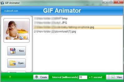 To work with SSuite GIF Animator, you only need to download it. After downloading, you can extract its files and can use it directly. On its simple to use interface, what you need to do is just add supported images (jpg, jpeg, or bmp) from stored location of your computer. After adding desired images, you can set the interval (in milliseconds) for your animation. Now hit the create button. This action will let you create as well as save your gif animation to location of your choice.