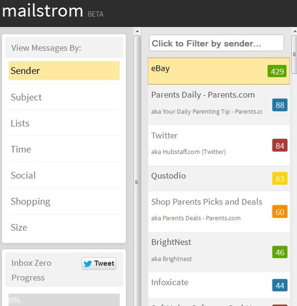 Mailstrom is a free email inbox cleaner which will help you clean your email inbox if you have a very large number of messages in it. It works with all the major email providers like Gmail, Apple, Yahoo, AOL and every other email provider which supports the IMAP protocol. Once you connect your email account with Mailstrom, messages can be sorted based on sender ID, email subject, size, social (filters email from social networks) and so on.
