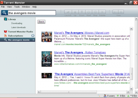 When one enters the name of the file, Torrent Monster returns a list of sources. The user then has to simply select a source and download the file to the desired location.