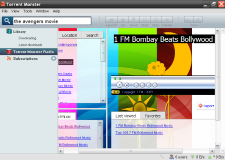 The search box is right below the menu bar. The side bar shows the user the list of the downloading files and downloaded files. Then comes the Torrents Monster Radio which allows the user to listen to internet radio. The stations are classified under genres and locations which makes the entire process easier. Subscription option allow Torrent Monster to give the user live updates about newly downloaded contents.