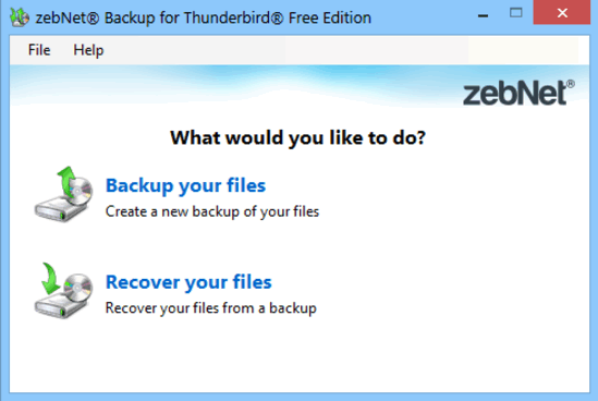 Step 1: Fire up zebNet Backup for Thunderbird, and select the Backup your files option (assuming you already have Thunderbird installed on the system). Once you do that, you’ll see a screen like this: