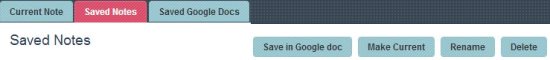 Then you have four options on the right side of the window. The first one is to save your notes by syncing them with Google Docs. Second option is to change the status of any saved note to current notes so that you can modify them. Rename is for changing the heading of your notes. Deleting is obviously for deleting selected notes.