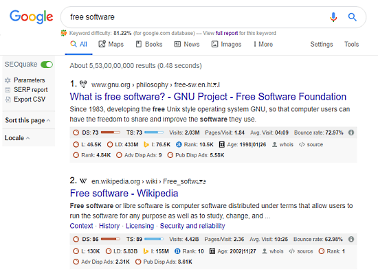On the Google SERP, this extension offers a detailed analysis of the results and keywords. At the top, it shows you the keyword difficulty. Then, each result in the SERP shows the various SEO parameters for the respective domain. You get a SEOquake panel on the left where you can customize the SEO parameters accordingly. You can also sort the results by SEO parameters like Alexa ranking, SEMrush ranking, etc. From the Locale options, you can also change the change country and language to get localized results. This extension generates an SEO report of the SERP that you can export to CSV.