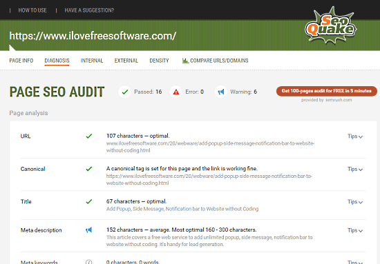 SEOquake is one of those rare browser extensions that let you check various SEO metrics on the respective website. Unlike other extensions, SEOquake is not limited to a single function; it provides you detailed SEO metrics with SEO audit, Keyword Density report, internal and external link analysis, social media metrics, mobile compatibility and more. You can check all these details for the currently open page or the whole website and customize the extension parameters as per your needs. On top of that, it offers SERP analysis as well which you can export in CSV format.