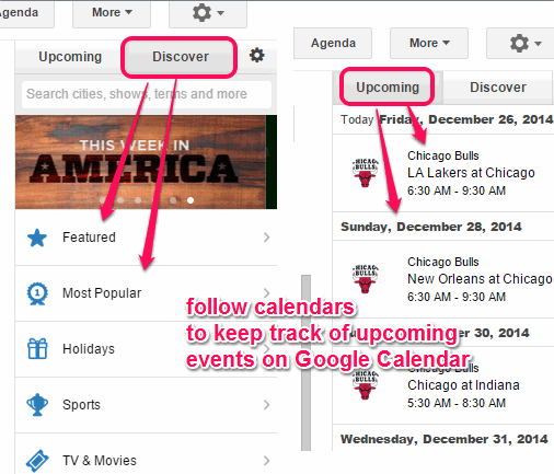 UpTo is a free Google Chrome extension to discover events related to sports, music concerts, TV shows, finance, horoscopes, etc., and keep track of upcoming events directly on your Google Calendar. It provides different calendars for different interests. You can follow any calendar of your choice. After this, list of all upcoming events of that calendar are provided on a sidebar within the Google Calendar.
