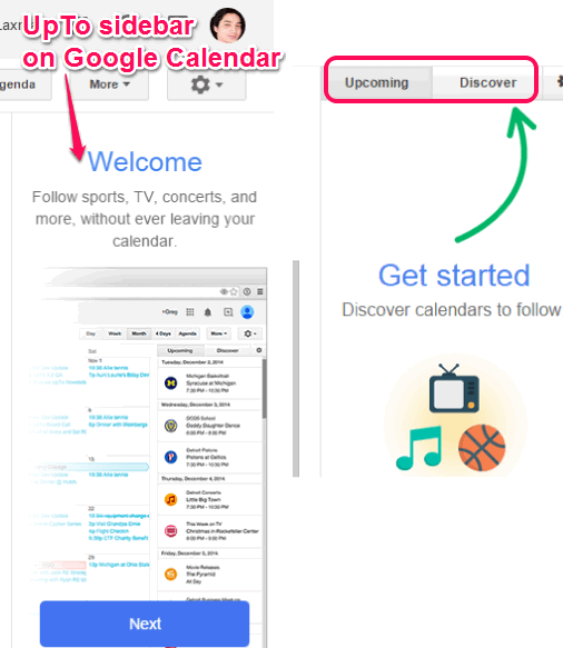 Install this Google Chrome extension using the link placed at the end of this review. After installation, open your Google account. Now open Google Calendar. You will find a sidebar on right side, like it is visible in the screenshot below. In that sidebar, two main tabs are available: Discover and Upcoming.