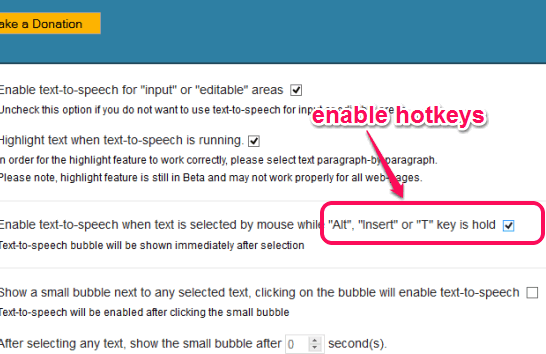 When you want to activate hotkey(s) of this add-on, then first access Settings of this add-on. After opening the settings page, enable the option associated with hotkeys. It provides preset hotkeys: ‘Alt’, ‘Insert’, and ‘T’ for reading the text.
