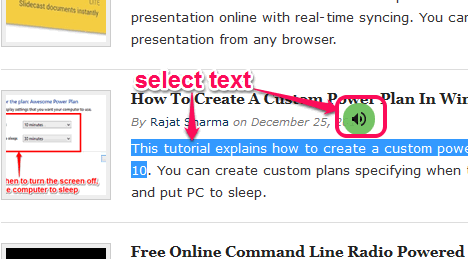 Open a webpage and select some text. You will notice that a green voice icon is visible ( see the screenshot below). Click on that icon and it will start reading that text for you. Selected text will also be highlighted automatically.