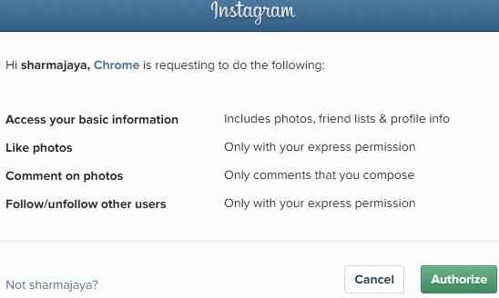 Once you enter your username and password, a authentication window will come up, asking you to authorize this extension to use your Instagram details. This window can be seen in the screenshot below.