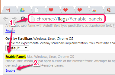 Step 1: Open a new tab and access chrome://flags/#enable-panels. It will help you access Enable Panels option. After accessing this option, tap on Enable option.