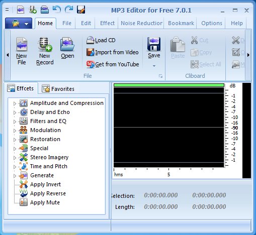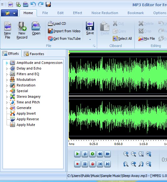 Interface of MP3 Editor Free is very modern looking, with the same interface design that you get in Office 2007. Top left corner of the screen holds the menu for opening up files, saving edited audio files and so on. Down below we have the famous ribbon interface, where again you can open up files, but with the help of tabs at the top you can also access other components of this free audio editor like effects, noise reduction and so on. Key features of MP3 Editor Free are: