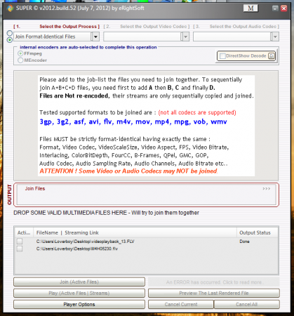 - Other: This app also comes with options to split or join multiple audio or video files of the same format. In the joining process files are not re-encoded; their streams are only sequentially copied and joined. Audio and Video streams can also be MUX-ed together using this software. Super can also play as well as save different Internet media streams having different protocols.