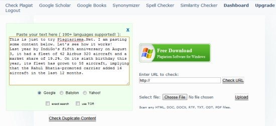 Plagiarisma.Net is a free online plagiarism detection service that lets you check the presence of copied content. In fact, it also enables you to use TOR so that you can remain anonymous on the internet while checking for plagiarized content. You can also opt for some other interesting services available on the website. Let’s see how this can help you in detecting plagiarism:
