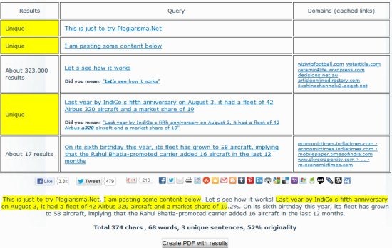 As you can see, the results are quite clear. The highlighted sentences represent unique content. While the content which is copied is not highlighted and you can check out the domains from which it has been copied. The links are mentioned in the rightmost column. The completely summary is also given at the bottom. You can even create a PDF of your results.